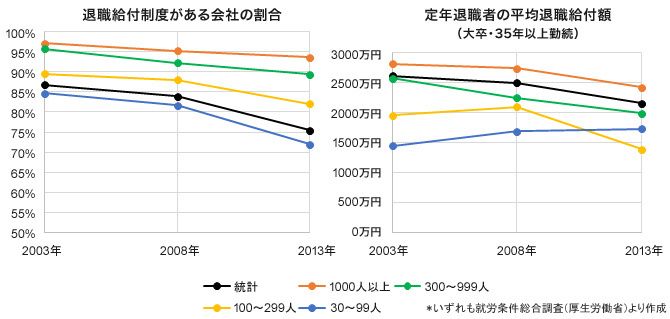 導入割合を見ると、黒い線で示した総計で、87%程度から75%にまで低下しています。全ての企業規模で低下していますが、特に30~99人の中小企業において顕著となっています。これは、退職金制度を廃止する企業に加え、ベンチャー企業など創業期の会社では退職金制度を設けないケースが増えているためと考えられます。小さな会社のほうが企業数は圧倒的に多いため、それに引きずられる形で全体の導入割合も大きく下がっているのです。
