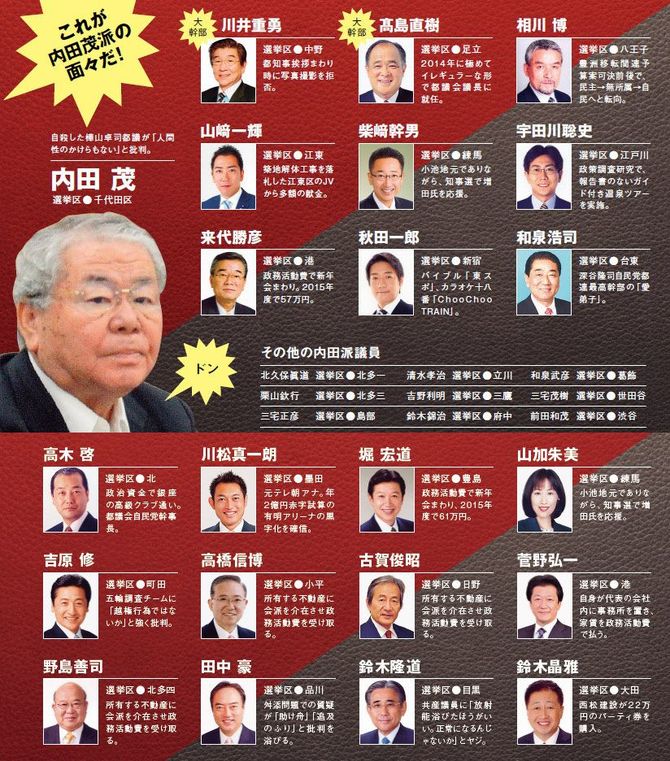 今回、プレジデント編集部は小池百合子都知事の陣営幹部が所持していた「内田派閥」のリストを入手した。資料横に記された大量の手書き文字が陣営幹部のものと一致していることから、小池陣営側の都議会自民党への洞察が深く窺える資料と判断し、公開に踏み切ることにした。図が、そのリストに記載された都議会議員の面々である。その多くの議員が、政治資金・活動費の使い道に大きな問題があることが報道されている。