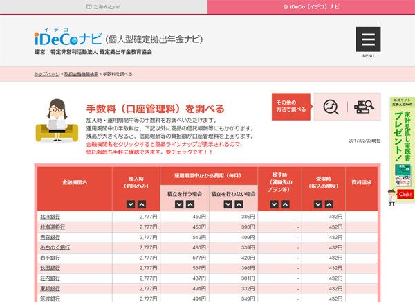 なお、運営管理機関を選ぶ際は、運用したい商品があり、手数料が安いところを選ぶと有利になります。手数料の比較は、確定拠出年金教育協会が運営する「iDeCoナビ」が便利です。http://www.dcnenkin.jp/search/commission.php
