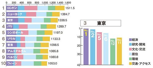 世界3位の総合力を持つ東京。環境、交通・アクセス、居住面の改善で、さらに上のランキングも狙える。4位以下は、パリ、シンガポール、ソウル、香港と続く。