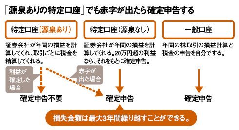 「源泉徴収あり」は、証券会社が株式等の売買損益にかかる税金の計算から納税まで代行してくれるもので、原則的に自分で確定申告する必要はない。ただし、サラリーマンの場合、通常なら税金のかからない年間20万円以下の利益が出た場合も源泉徴収されてしまい、この分の税金は確定申告により還付を受けることはできない。一方、「源泉徴収なし」は、申告に必要な年間取引報告書は金融機関が作成してくれるが、確定申告は投資家自身ですることになる。そのほか、一般口座では損益計算も確定申告も自分でしなければならない。年間20万円以下の利益については、申告をする必要はないのがメリットといえる。