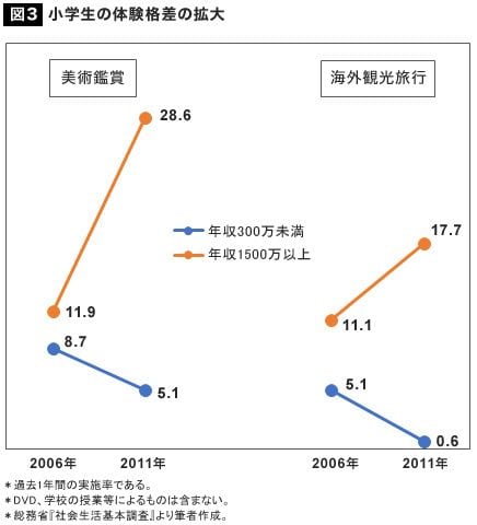 なお、家庭環境による「体験格差」は、近年になって拡大の傾向にあります。図3は、小学生の美術鑑賞と海外観光旅行の経験率が、過去5年間でどう変わったかを、貧困層と富裕層で比べたものです。