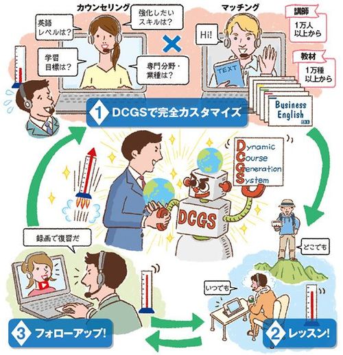 vipabcでは、ユーザーに講師をあつらえる際に、独自に開発した「DCGS」(Dynamic Course Generation System)というシステムを使用する。英語レベルに加え、年齢や職業、趣味嗜好といったデータを基に、個々のユーザーに最適な講師や教材、クラスメイトをマッチングさせるという、画期的なシステムであり、受講者と講師、両方からのフィードバックを蓄積することで、利用するたびにマッチングの精度が上がる仕組みだ。