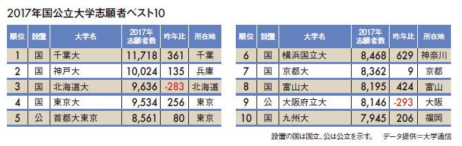 2位は昨年の4位から躍進した神戸大で、6年ぶりの志願者増の1万24人となった。1万人を超えたのはこの2校だけだった。今年は国際文化学部と発達科学部を改組し、新しく国際人間科学部を新設した。志願者増の理由として大きいのは、今年から大阪大が後期試験を廃止し推薦とAO入試の世界適塾入試を新しく実施したことだ。そのため、大阪大後期試験廃止の受け皿として、神戸大後期が人気を集め、なかでも文、法学部で志願者が増加した。