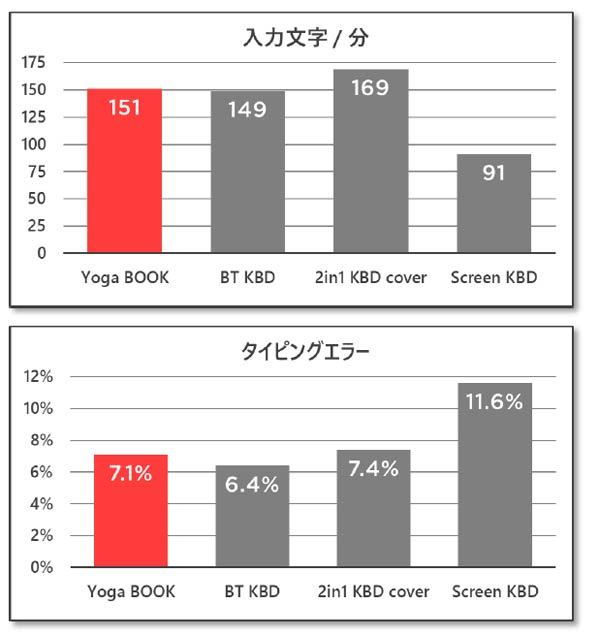 その後開発が進み、YOGA BOOK発表の少し前にレノボ社内でタイピング生産性の試験が行われた。アメリカ、ヨーロッパ・中東・アフリカ、中国、日本のレノボ社員あわせて40人がYOGA BOOKのほか数種類のキーボードで文章を入力し、キー入力の速度やエラー率の計測を行ったのだ。「社内で開発に携わったエンジニアは参加するなと言われた試験でした。どこまでいけるか不安だったが、結果を見るとかなり満足できるレベルであることがわかった」(河野氏)