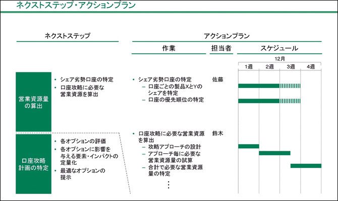 プロジェクトのゴールは資料を読んでもらうことではなく、読んだ後、関係者に動いてもらうこと。そこで今後の全体の方向性を、プレゼンターの側からネクストステップとして提示する。そしてAというネクストステップを実現させるために必要な活動をA1、A2……と分割させて、アクションプランに細かく落とし込んでいく。作業内容、担当者、スケジュールなどを明記し、先ほど書いたワークプランがより現実的な形に。