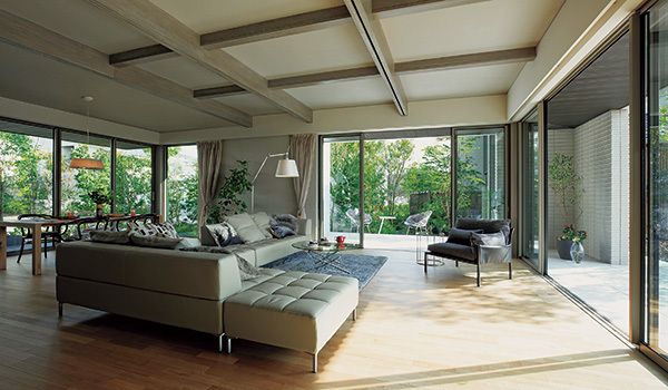 この屋外の自然を暮らしに取り込む「スローリビング」空間の豊かさを支えるのは、積水ハウスならではの確かな技術力だ。天井高2.74m、最大7mの無柱の大スパン空間の、今までにない開放感は、積水ハウス独自の新構法「ダイナミックフレーム・システム」が実現した。