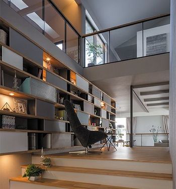 この多様な高低差は、家族や来客の関係を巧みに調節する役割を果たしてくれるだろう。大勢でにぎやかに集まるときは、広々としたリビングで。アウトドア空間も併せて活用できる。逆に、しっとりと語り合うには、ピットリビングがよさそうだ。ひとり読書に没頭したければ、吹き抜けのライブラリーへ。姿は隠れても空間はつながっているので、家族の気配は伝わってくる。