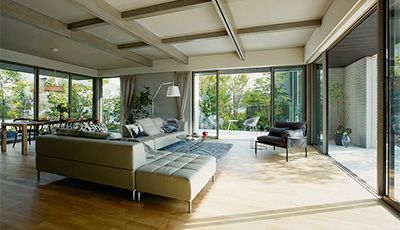 メインのリビングダイニングは、三方向のほぼ全面が開口で、のびのびとした空間が、そのまま緑あふれる庭につながっていく。この屋外の自然を暮らしに取り込む「スローリビング」空間の豊かさを支えるのは、積水ハウスならではの確かな技術力だ。天井高2.74m、最大7mの無柱の大スパン空間の開放感は、積水ハウス独自の新構法「ダイナミックフレーム・システム」が実現した。