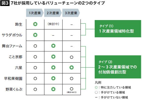 7社のバリューチェーンは、1次産業領域で大規模×高付加価値で差別化しているタイプ(1)(サラダボウル、鈴生)と、2~3次産業領域で付加価値を創出しているタイプ(2)(舞台ファーム、六星など)に分類されます(図3)。