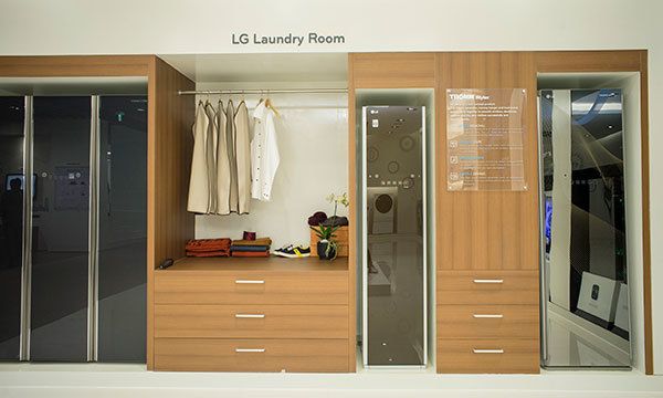 LG stylerは、衣類を庫内の専用ハンガーなどにかけるだけでケアできる、世界初のクローゼット型のホームクリーニング機である。衣類についてしまったしわやニオイはもちろん、シーツや枕などに潜んでいるダニ、コートなどに付着する花粉も、掛けておくだけですっきりと取り去りリフレッシュできるというから画期的だ。
