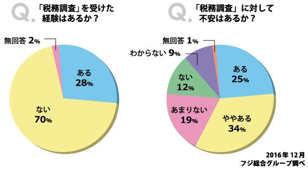フジ総合グループが相続に関心のある20代から80代までの男女277人を対象に、2016年12月に行ったアンケートによれば、実際に「税務調査を受けたことがあるか?」との問いに対し、28%の人が「ある」と回答。「税務調査に対して不安はあるか?」との質問では、「ある」「ややある」と回答した人が約6割に上った。