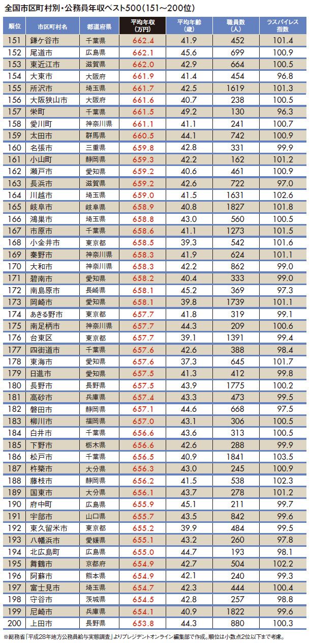 2017公務員給与ランキング #公務員 #年収・給料 2017/06/01 9:00 #1 #2 #3 "地方公務員年収ランキング"トップ500 「トップ3」を九州の自治体が独占 PRESIDENT Online プレジデントオンライン編集部 +フォロー 前ページ 1 … 4 5 6 … 11 次ページ 次ページ 1 … 4 5 6 … 11 関連記事 "地方公務員年収ランキング"ワースト500 「学歴別」平均年収ランキング 「クビになりやすい業種・会社」ランキング100 ランキング 1位 毎朝「スプーン2杯」水で薄めて飲むだけ…血糖値を下げ脂肪を減らすコンビニで買える調味料の名前【2026年1月BEST】 ランキングをもっと見る マネー #公務員 #年収・給料