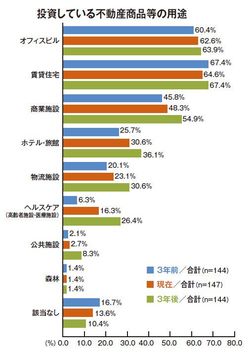 「不動産市場に関する国内投資家アンケート調査」(国土交通省)より。調査対象は、Jリート・私募ファンドの運用機関、不動産会社・建設会社、銀行・保険会社、企業年金など。3年前、現在、3年後(想定)に投資実績及び投資意向のある企業等に限定した回答。