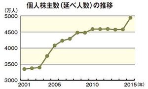 2001年から15年の間に、個人株主数はおよそ1.5倍に増加。NISAなどの後押しもあり、世代の幅も広がっている。早くから投資に親しむことで、経験を積み、ノウハウを蓄積できる。一方で、何の取り組みもしない人は取り残される可能性も……。
