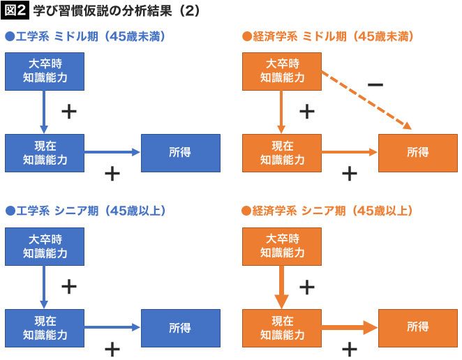 まず、図1をみてもらいたい。これは、理系(工学系)と文系(経済学系)それぞれの分析結果をイメージ化したものである。「大卒時知識能力→現在知識能力→所得」と続くプラスの関係が、学び習慣仮説の強調する経路(パス)になるが、第1の点として注目したいのは、「大卒時知識能力」と「所得」のあいだにひかれているパスだ。経済学系にはマイナス効果が認められ、すなわち、大学時代に学習を積んだ者ほど、低く評価されてしまうことを意味している。総体的にみれば、それ以上に強い学び習慣のプラス効果ゆえに、大学での学習に意味はあるという結論が導かれる。けれども同時に、就職してからなんらかの理由で学習をやめた者にとっては、マイナスの効果だけが残る。「大学時代の余計な知識は邪魔だ」と言われかねないのが、経済学系の世界なのである。