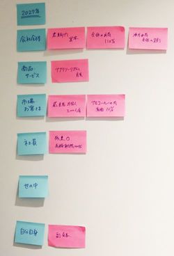 まずは、この付せん紙に10年後(2027年)のイメージを、以下の項目について書いていってみてください。「○○がこうなっている」など、状態を表すような形でお願いします。「売上比率が〇%」といった具合に定量的な書き方でも、「笑顔の社員が増えている」といった定性的な書き方でも構いません。書けるところから、書いてみてください。