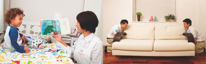ベビーシッターと介護ケアの2本立てのサービスを提供するのは「ポピンズ」。“ナニー”と呼ばれるベビーシッターは、イギリスの専門学校が行う厳しい研修を受けた精鋭。大事な子供を預かるサービスゆえに、人材育成には特に力を入れている。