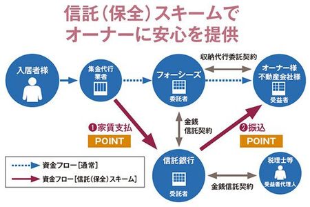 具体的には、家賃を信託銀行が預かり、銀行がオーナーに振り込む。つまり、万一フォーシーズの事業継続が困難になっても家賃は保全されるのだ。