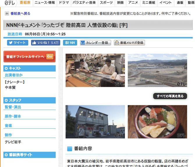 6月5日の『NNNドキュメント』(日本テレビ)で放送されたのは、「うったづぞ 陸前高田 人情仮設の鮨」と題された回だった。再生ボタンを押して録画したこの番組を観始めるとき、僕は「ああ、被災地モノか」と思った。しばらく経って、そんなことを思ってしまったことに愕然とした。