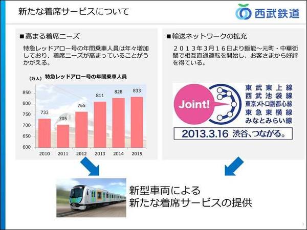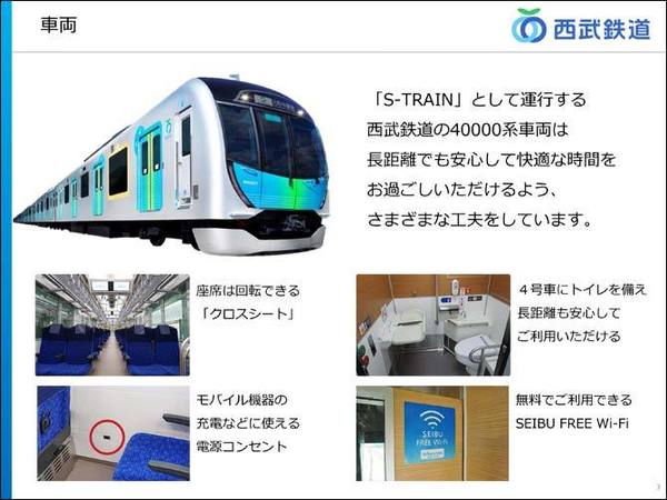 「相互直通運転が成功している」という各社の共通認識の上に立って、有料指定席列車の提案にあたり、西武鉄道のレッドアローの実績を提示。そのために製造する新型車両を提案し、各社の沿線の魅力を踏まえて、新たな列車サービスの必要性を説いた。他社の通勤ライナーとは異なり、レジャー向けの要素が強いところも興味深い。