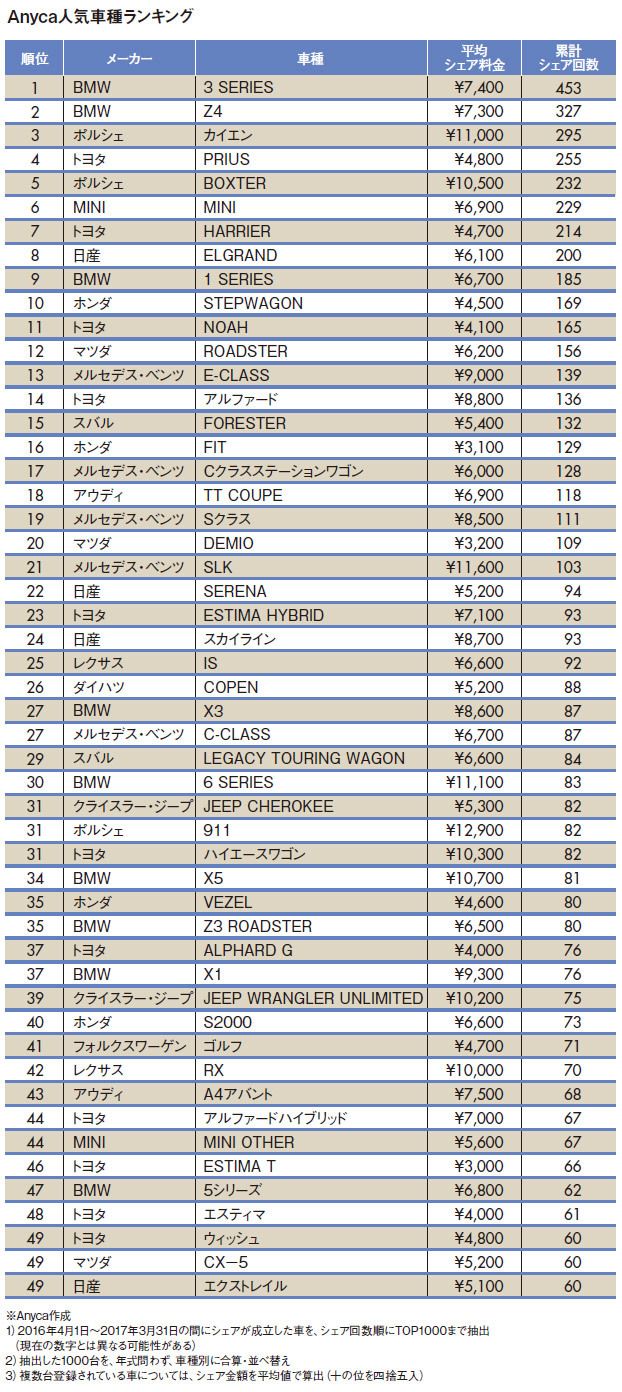 #自動車・輸送機器 #BMW 2017/06/29 9:00 1位BMW ベンツ圏外 カーシェア人気車種 DeNAが仕掛けるカーシェアアプリ PRESIDENT Online 熊山 准 +フォロー ライター 前ページ 1 2 3 (図版作成=大橋昭一) 【関連記事】 "住みたい街"恵比寿より北千住を選ぶ理由 東京より幸せ「地方の給与1位企業」20社 "地方公務員年収推計"都道府県ランキング 大企業社員が評価「幸せな会社」ランキング 「年収ランキング」ベスト500! 給料が高い会社、大公開 1 2 3 熊山 准(くまやま・じゅん) ライター 1974年徳島県生まれ。ライター、アーティスト、夕焼けハンター。http://www.kumayama.com/ <この著者の他の記事> 「シュッとした写真」を撮ってもらうコツ 関連記事 "住みたい街"恵比寿より北千住を選ぶ理由 東京より幸せ「地方の給与1位企業」20社 "地方公務員年収推計"都道府県ランキング ランキング 1位 やっぱり高市首相の戦略は正しかった…創価学会票を当てにしたのに「小選挙区で一人負け」立憲議員の大誤算 ランキングをもっと見る ライフ #自動車・輸送機器 #BMW #ベンツ #DeNA #カーシェア