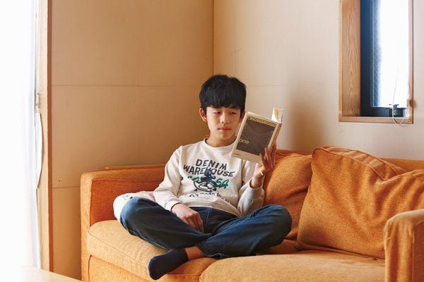 *家でくつろいでいるときも将棋の本を手にすると表情が変わる。「将棋の息抜きですか。詰将棋かな。パズル感覚で難問に挑戦するのが好きです」と語るほど、将棋漬けの毎日を送る。また、自宅では対局の振り返りをしたり、ネットで遠方のライバルと対局をする。岡村智明=撮影