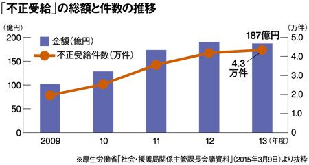 厚生労働省は2015年3月、2013年度の生活保護費の不正受給が4万3230件、総額186億9033万円だったと発表しました。金額は前年度より約3.6億円減ですが、件数は過去最悪を更新しました。生活保護は制度上、住民登録がなくても居住実態さえあれば申請が行えます。このため自治体間で受給実態の情報が共有されておらず、不正受給の原因の一つともなっていました。