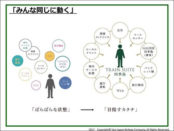 鉄道は、それぞれの役割をきっちり守り、その総体で運営してきた。各自の分担の経験と責任の積み重ねだけでよかった。それに、全員が共通する認識として、新たな要素「GOLDEN EXPERIENCE」を追加した。このキーワードについて、それにかかわる各職場で、何をすべきかひとつひとつ検討してもらった。