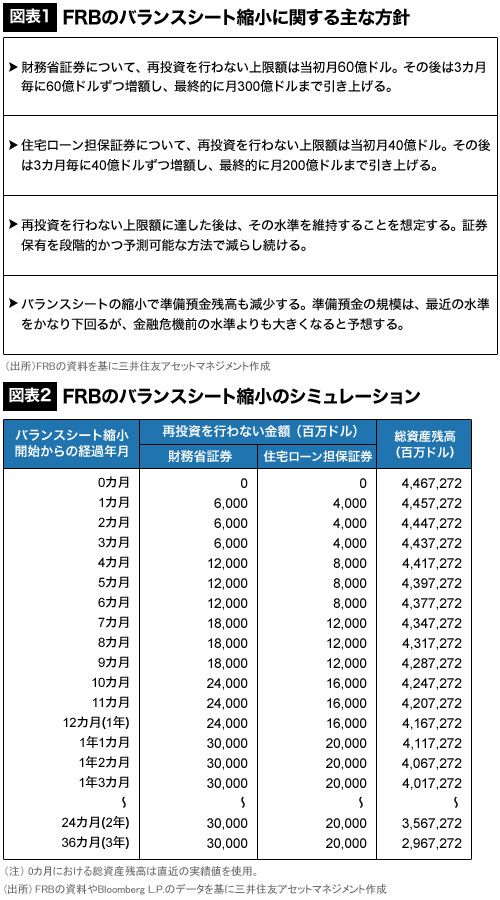 それによると、バランスシートの縮小は、FRBが保有する米財務省証券(国債)などの再投資額を段階的に減らすことで、ゆっくりと進められることになる。開始時点における再投資見送り額の上限は、米国債が月60億ドル、米住宅ローン担保証券(MBS)が月40億ドルである。いずれも上限は3カ月ごとに引き上げられ、最終的に米国債は月300億ドル、MBSは月200億ドルとなる。現在、FRBのバランスシート規模は約4.5兆ドルだが、このペースだと、開始から3年程度で3兆ドルを割り込む計算になる(図表2)。