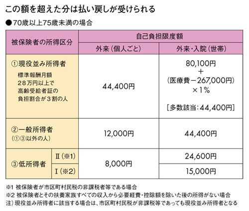 これが、70歳になると図のように引き下げられ、所得に応じて4段階に分類される。例えば、一般的な所得の人の1カ月あたりの自己負担額の上限は、通院が「1万2000円」。通院と入院の両方をした場合は「4万4400円」だ。夫婦ともに70~74歳で同じ健康保険に加入しているなら、世帯での限度額も4万4400円だ。