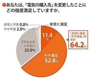 ではこれまでに、実際切り替えを行った人はどれくらいいるのだろうか──。電力広域的運営推進機関の発表によれば、その数は約400万件(2017年5月末までのスイッチング件数)。毎月継続的に、数十万件程度の切り替えが発生している。電気の購入先を変えた人の満足度は総じて高く、「非常に満足」「やや満足」を合わせると64.2%。逆に「非常に不満」「やや不満」という人は2.8%しかいなかった。