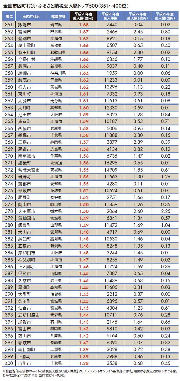 ふるさと納税受入額ランキング #ふるさと納税 2017/07/26 9:00 #1 #2 「ふるさと納税受入額」全国トップ500 1位は「肉と焼酎」、2位は「家電」 PRESIDENT Online プレジデントオンライン編集部 +フォロー 前ページ 1 … 8 9 10 11 12 次ページ 次ページ 1 … 8 9 10 11 12 関連記事 「ふるさと納税受入額」全国ワースト500 "地方公務員年収推計"都道府県ランキング 東京より幸せ「地方の給与1位企業」20社 ランキング 1位 1回10分・室内でもできる…整形外科医が「姿勢も血流もよくなる」と勧める"肋骨ウォーキング"の効果【2026年1月BEST】 ランキングをもっと見る マネー #ふるさと納税