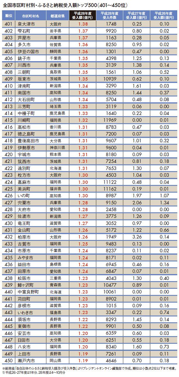 ふるさと納税受入額ランキング #ふるさと納税 2017/07/26 9:00 #1 #2 「ふるさと納税受入額」全国トップ500 1位は「肉と焼酎」、2位は「家電」 PRESIDENT Online プレジデントオンライン編集部 +フォロー 前ページ 1 … 8 9 10 11 12 次ページ 次ページ 1 … 8 9 10 11 12 関連記事 「ふるさと納税受入額」全国ワースト500 "地方公務員年収推計"都道府県ランキング 東京より幸せ「地方の給与1位企業」20社 ランキング 1位 「男性だらけの会議」では絶対に気づかない…女性自衛官が災害現場で真っ先に提案した“2つの生活必需品” ランキングをもっと見る マネー #ふるさと納税
