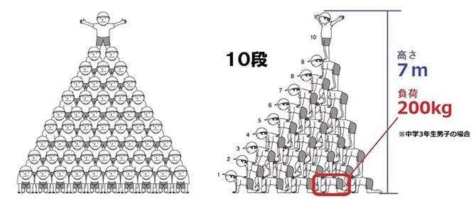 中学校では10段ピラミッドが、いくつかの学校で披露された。この場合、中学3年生だと高さは7m、土台の最大負荷は200kgに達する。