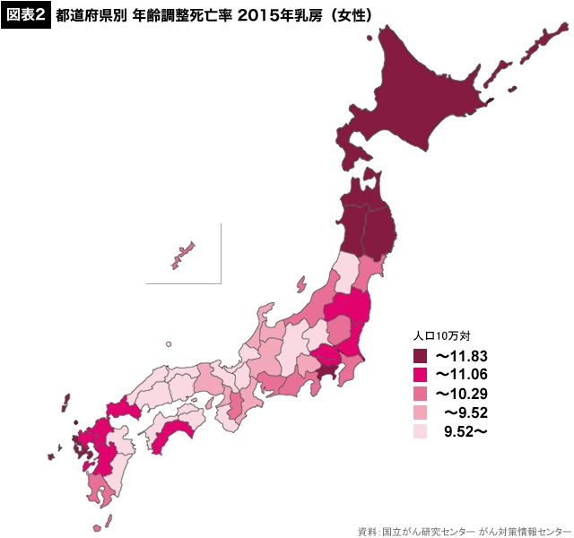 乳がんは大都市圏と東日本で死亡率が高い