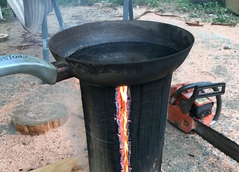 ウッドキャンドルとは、長さ40cm、直径20~30cm程度の丸太に切り込みをいれ、その切り込みに着火剤を差し込んで燃やす「木のろうそく」。丸太の内側に火がつくので、丸太の円形の切り口に鍋を置いてコンロ替わりにしたり、そのままたき火にしたりできる。