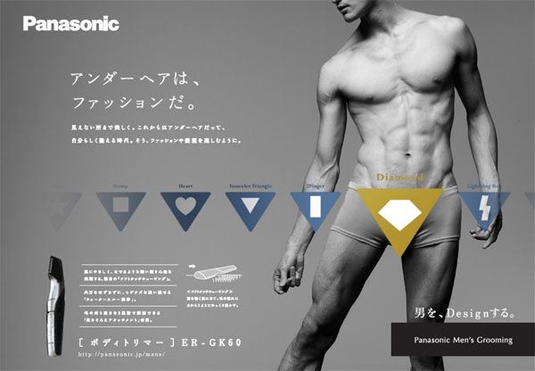 商品ポスターでは“細マッチョ”な男性モデルが上半身裸になっており、その前には整えられたアンダーヘアとおぼしき三角のフォルムが並ぶ。ハート形や稲妻形、ダイヤモンド形など、なかなか刺激的なデザインだ。