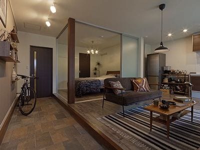 3階建て2棟24戸の建物に対し、用意したプランは12通り。写真の部屋は1階、趣味にこだわりのあるシングル男性を想定した設計だ。玄関から専用庭まで、一直線に通り抜けられる「通り土間」が目をひく。土間の幅は1.2mあり、自転車の整備やDIYを楽しんだり、デスクを置いて書斎にしたりと、自由に使える。土間の壁は、入居者が自分で棚を取り付けることができるよう補強されている。