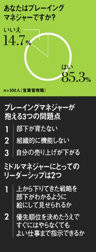 管理職になっても、自ら現場に出て契約を取り続ける。いわゆるプレーイングマネジャー制は、本人が営業マンとしては優秀であっても、部下を動かすという、リーダーシップにおいて破綻をきたしやすい。