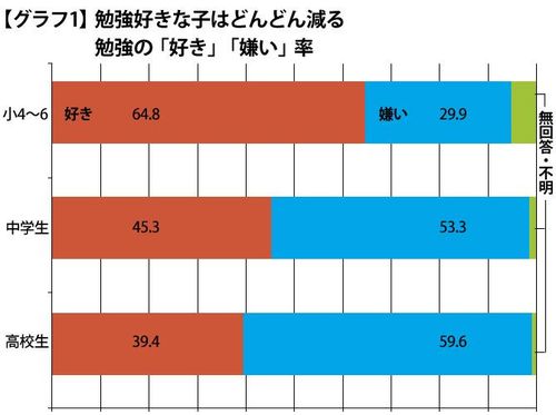 とくに顕著なのが、小学生と中学生の差である。「勉強が好き」と答えているのは、小学生(4~6年生)では64.8%だが、中学生では45.3%。20ポイントもダウンしている(つまり、中高生の半数以上が「勉強嫌い」)。勉強内容が難しくなるにつれて、「嫌い」派が増えてきているようだ(グラフ1参照)。