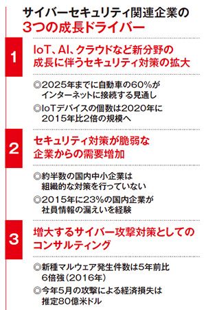 また、企業や公共インフラを標的とした悪質なサイバー攻撃も増えるなか、攻撃を受けた場合の対応演習など包括的なセキュリティのコンサルティングサービスが必要だという認識も広がっています。このような背景から、サイバーセキュリティ関連企業の今後の成長が見込めるわけです。