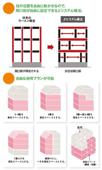 その最大の特徴は、独自の「β(ベータ)システム構法」にある。この構法は梁勝ちラーメン構造で、通し柱である必要がなく、柱の位置を自由に変えることができる。そのため各階ごとの間取りの自由度が高く、用途に合わせた快適な空間がつくりだせる。窓の位置もフレキシブルに、コーナーサッシも設けることができる。さらに多彩な屋根形状や各階の天井高も選ぶことができるため、都市部の斜線制限や容積率にも柔軟な対応が可能だ。フレキシブルな構造は二世帯住宅にも有利。つまり限られた土地の可能性を最大限に生かす建物を建てることができるのだ。