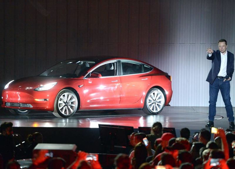 7月28日、テスラ「モデル3」納入開始を発表するイーロン・マスクCEO。(写真=AFLO)