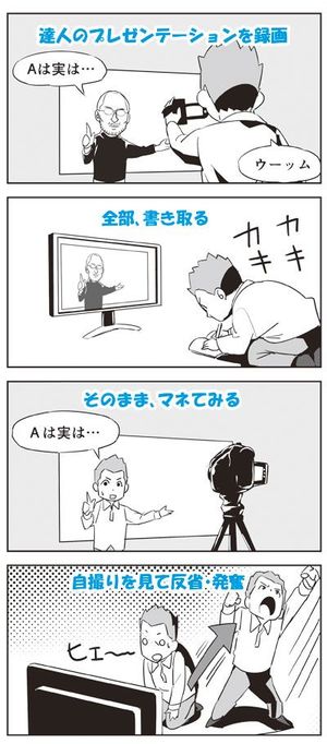 Uさんと自分がどう違うのか、どうすればその差を埋められるかなんて、すぐにはわかりません。ただ、草野球と大リーグのような巨大な差があることは、よくわかりました。いや、ミジンコとヒトの差と言っても過言ではないでしょう。緊急対応法は、達人をコピること。とぼとぼ家に帰った私がやったことは、「丸ごとコピー(ものまね)」です。数日後に迫ったプレゼンテーション本番をくぐり抜けるには、もうそれしかありません。