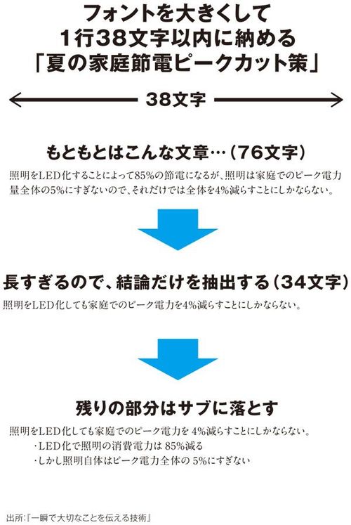 この「フォント縛り」は本当に強力で、伝える表現を簡潔にするだけでなく、ヒトに論理的な思考を強制します。フォントを大きく、そして1行に収まる文章に! これこそ伝えるプレゼンテーション資料作成のための、「大リーグボール養成ギプス」です。