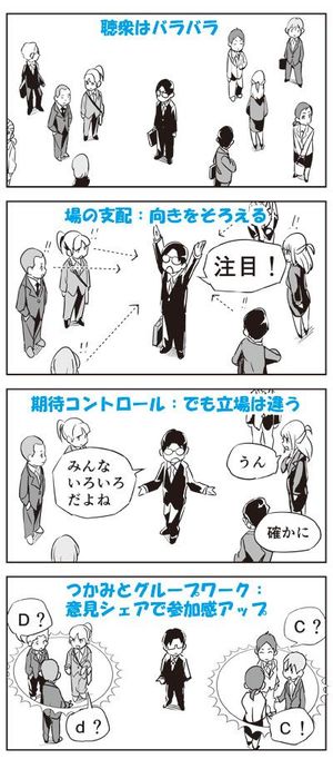 聴衆がいっぱいで興味もバラバラ。かつ、そんなにつかみに時間をかけてはいられない。多くを相手に数分や数十秒で心をつかまなくてはならない。多人数相手のプレゼンテーションではそこが難しいのです。講演のように、相手がほとんど初対面の人であればなおさらです。初対面の人が相手であれば、まずは自分を売り込む必要がありますが、このときに、権威者(有名人や偉い人)を引き合いに出して、自分を権威付けようとする人が結構います。「ハロー(Halo)効果」というやつです。ハローは聖人の背後から差す後光のこと。人は顕著な特徴に引きずられて、他の特徴に関しての評価がゆがみます。