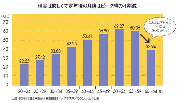 シニアの雇用条件は実に厳しい。図にあるように、1000人以上の大企業の大卒男子の定年後の月給は、ピーク時の約4割も減る。しかし、定年後の新しい仕事で見事に成功を収め、定年前よりも収入を増やしたシニアもいる。