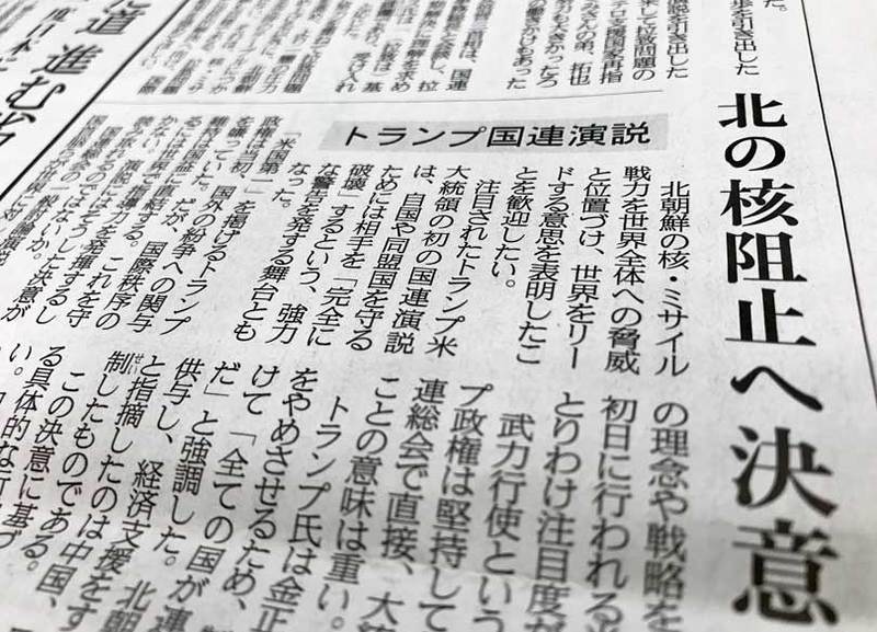 さらに「『米国や同盟国の防衛を迫られる事態になれば、北朝鮮を完全に破壊するしか選択肢はない』と最大限の脅しを利かした」と指摘したうえで、「これに先立って登壇したグテレス国連事務総長は北朝鮮の核・ミサイル問題に絡んで『激しい言葉のぶつけ合いは致命的な誤解につながる危険がある』と警告を発したばかりだった。トランプ氏と金正恩朝鮮労働党委員長の予測不能な両トップによる威嚇の応酬は、不測の事態を招きかねない」と主張する。