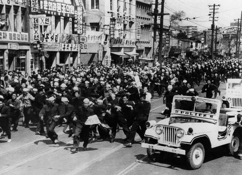 1960年、李承晩(イ・スンマン)大統領の独裁と恐怖政治に耐えかねた国民は、ついに大統領の退陣を叫びはじめます。全国にデモや暴動が広がり、84歳になっていた李承晩はこれらを抑え切れず、とうとうハワイへ亡命しました(四月革命)。